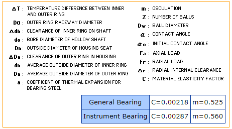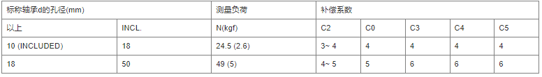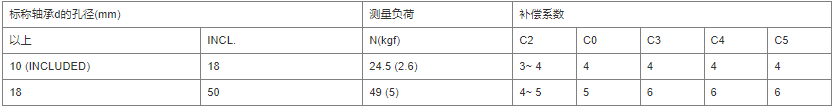 内部间隙是外圈、内圈和滚动体之间的间隙。通常,外圈相对于固定内圈的上下移动量称为径向内间隙,其左右移动量称为轴向内间隙。运行中的轴承内部间隙是一个重要因素,对噪声、振动、热和疲劳寿命等其他因素有重大影响。径向球轴承通常按其内部径向间隙分类。测量内部间隙时,轴承承受标准载荷,以确保所有轴承部件之间完全接触。在这种载荷下,测量值大于径向间隙的实际值;这是由于弹性变形。差异由下表中给出的系数补偿。